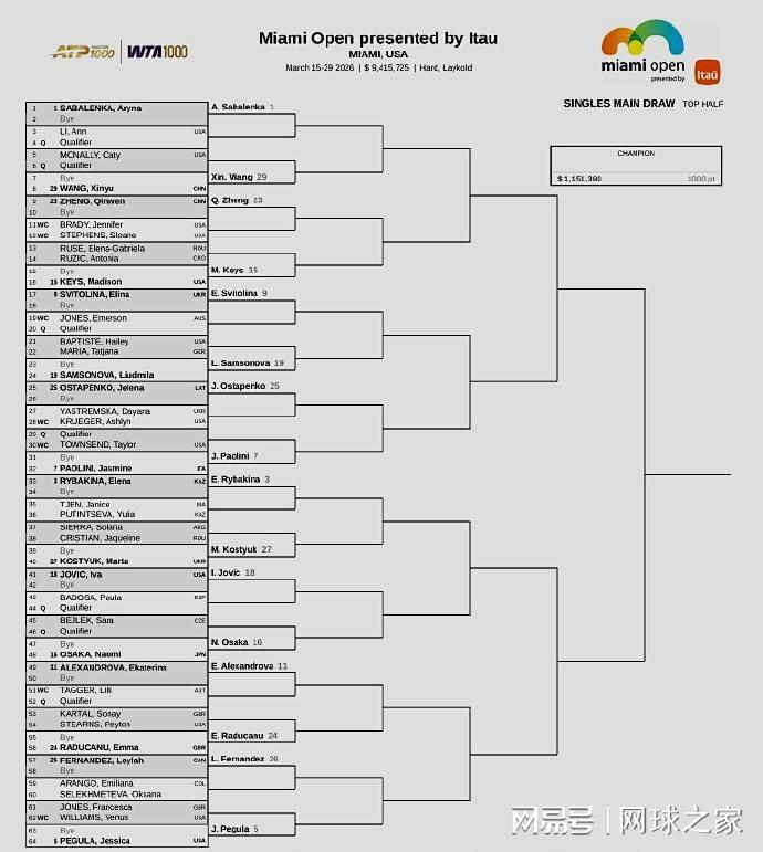 而WTA1000迈阿密站的单打签表已经出炉,前八大种子的对位:上半区,萨巴伦卡--鲍里妮、莱巴金娜--佩古拉;下半区,阿尼西莫娃--高芙、米拉-安德列娃--斯瓦泰克。上届八强、中国一姐郑钦文位列第23号种子,首轮轮空,次轮将对阵美国人布雷迪或斯蒂芬斯,第三轮的潜在对手是美国名将凯斯或刚刚赢过她的克罗地亚人鲁季奇,第四轮将对位世界第一萨巴伦卡,签表很硬,保分压力很大。